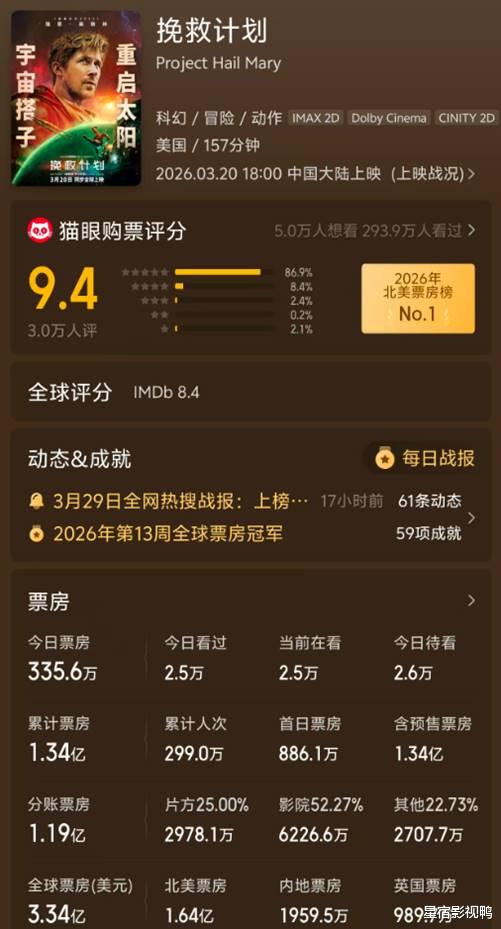 这部《挽救计划》在全球口碑井喷。