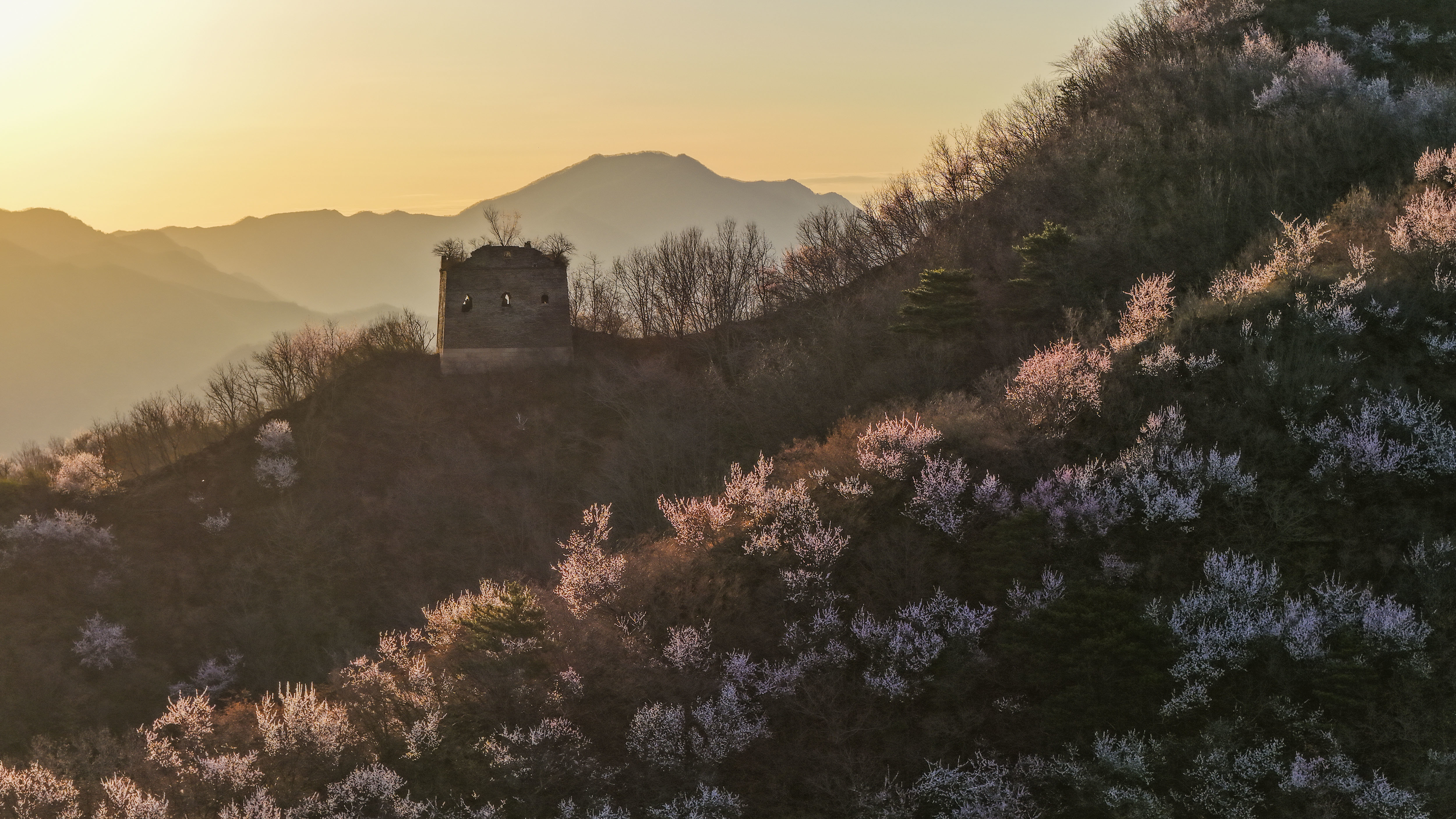 近日,随着气温回暖,河北省唐山市迁西县的长城周边山花烂漫,美如画卷。